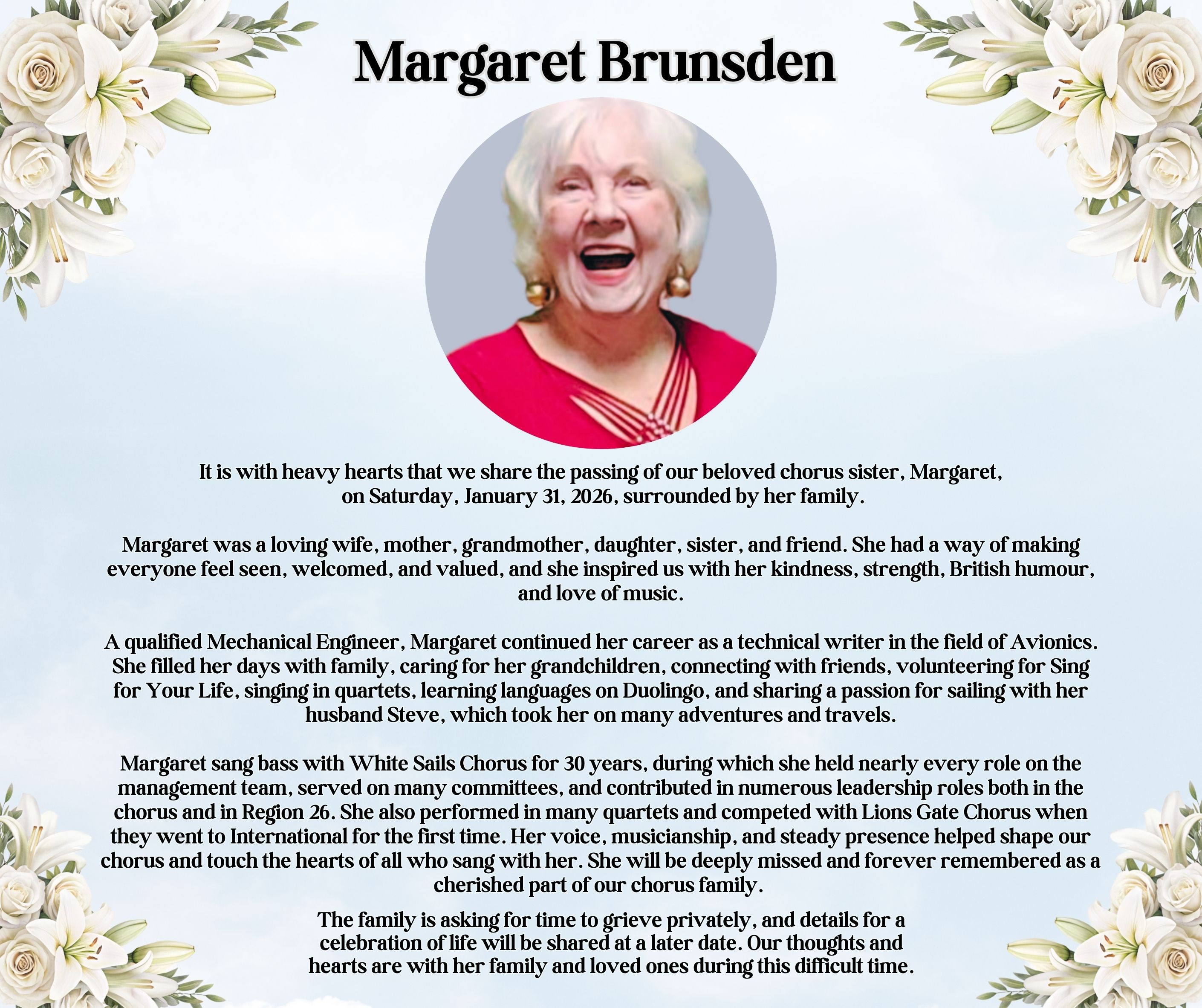 When Bev moved to the Okanagan, she joined White Sails A Cappella Chorus for many years. She was a strong singer and always made new members feel welcome and looked after as they stood beside her on the risers. In 2018 Bev attended the Regional Contest with White Sails even though her health was changing and she needed some assistance that hadn't been needed before. We were honoured and humbled to have her on stage with us as an active singer in our chorus.